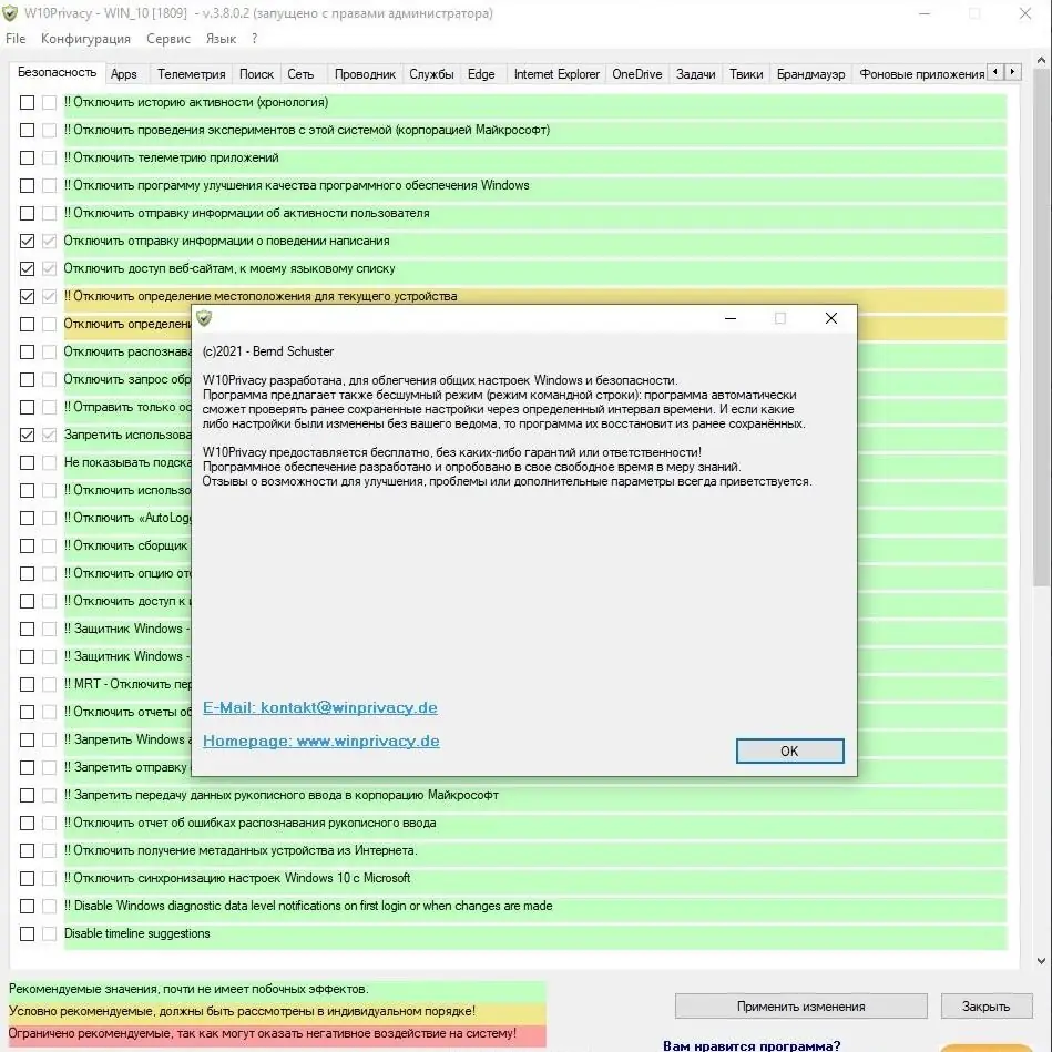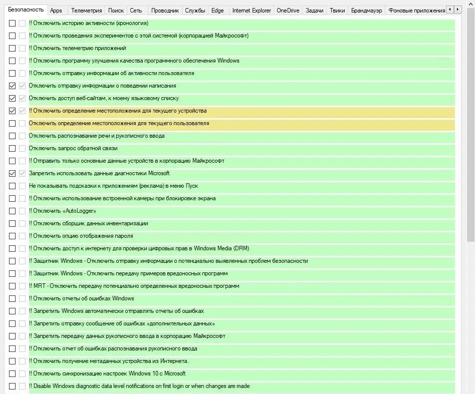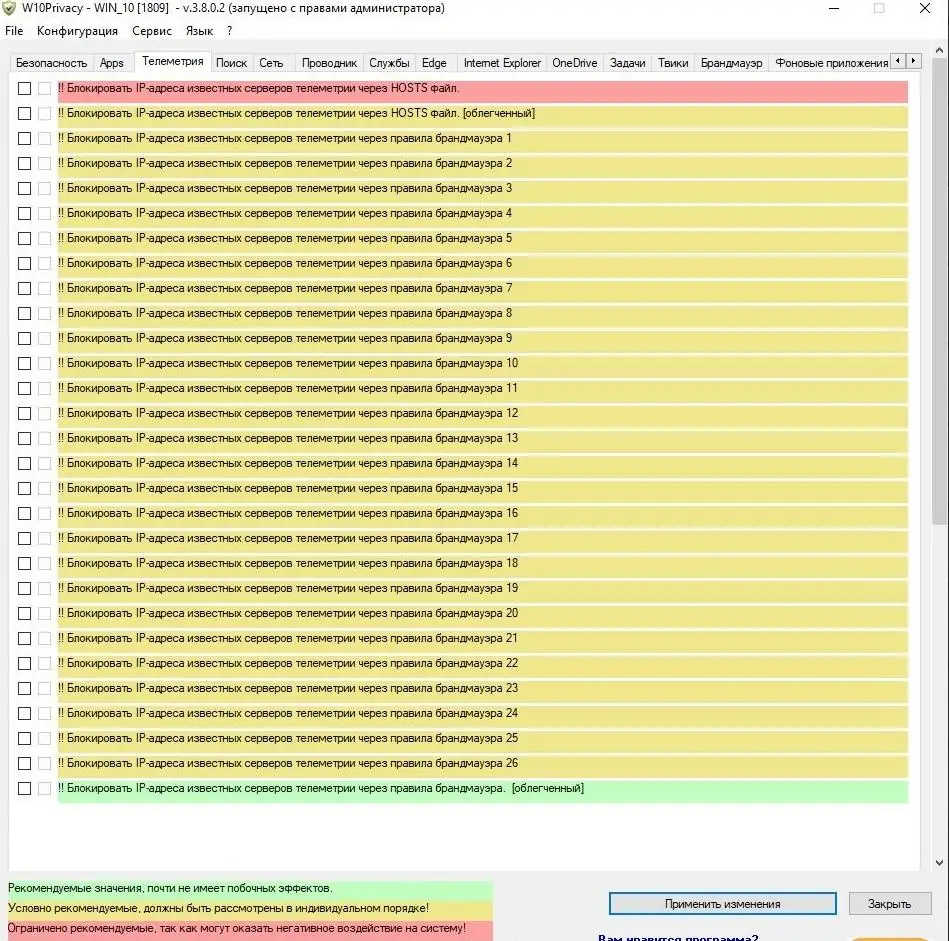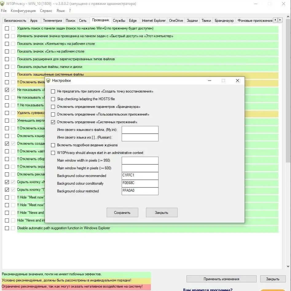 - Каждый параметр помечен цветом — зелёный, жёлтый или красный — в зависимости от степени риска при его отключении.