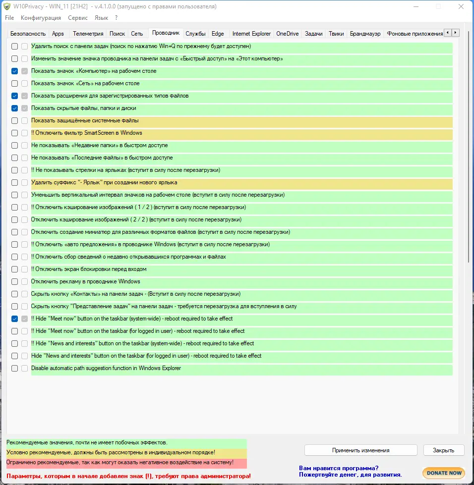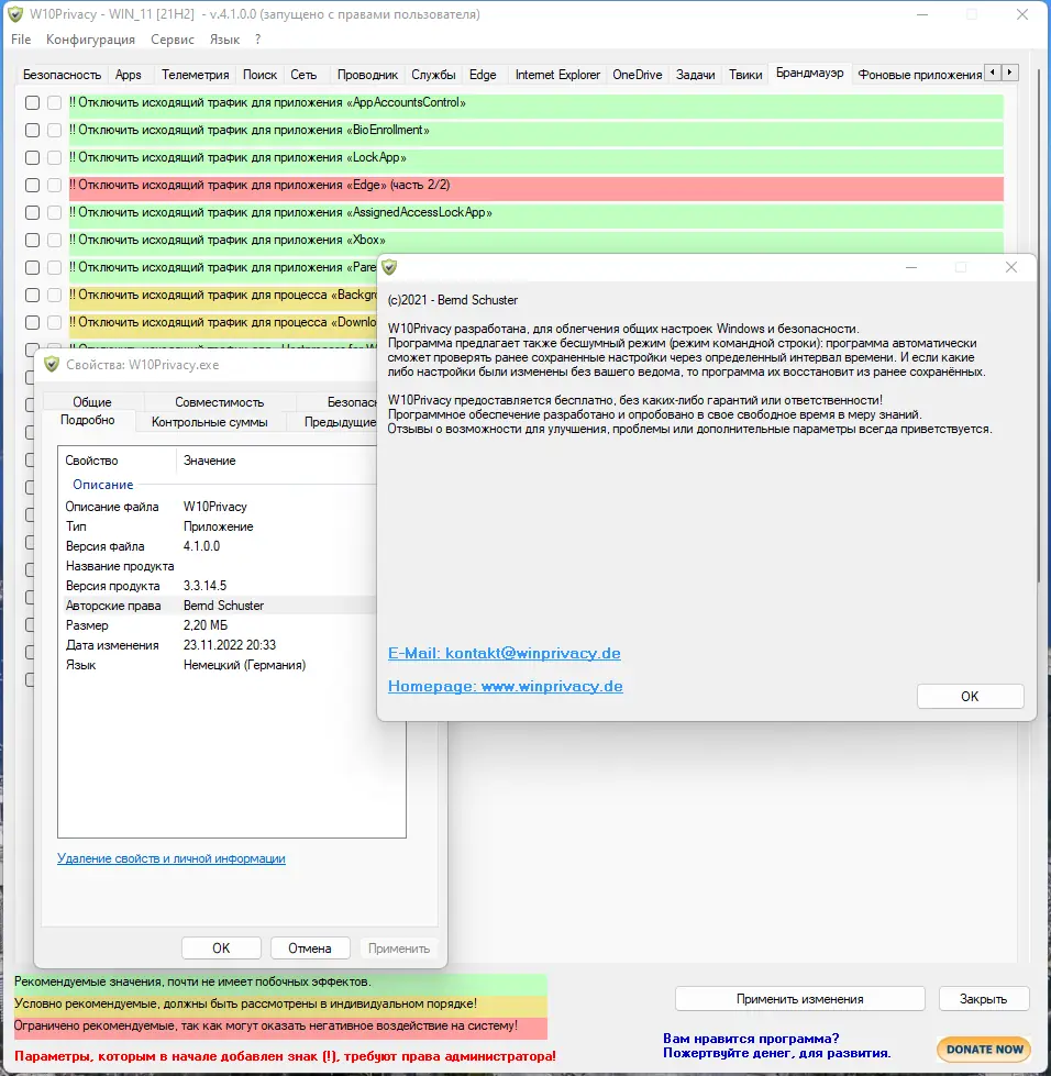 - Программа поддерживает точечное управление параметрами, влияющими на конфиденциальность, включая отключение Cortana и сбора данных о приложениях.