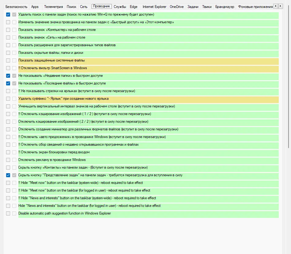 - Интерфейс разделён на 12 логических категорий, таких как телеметрия, реклама, обновления, службы и другие.