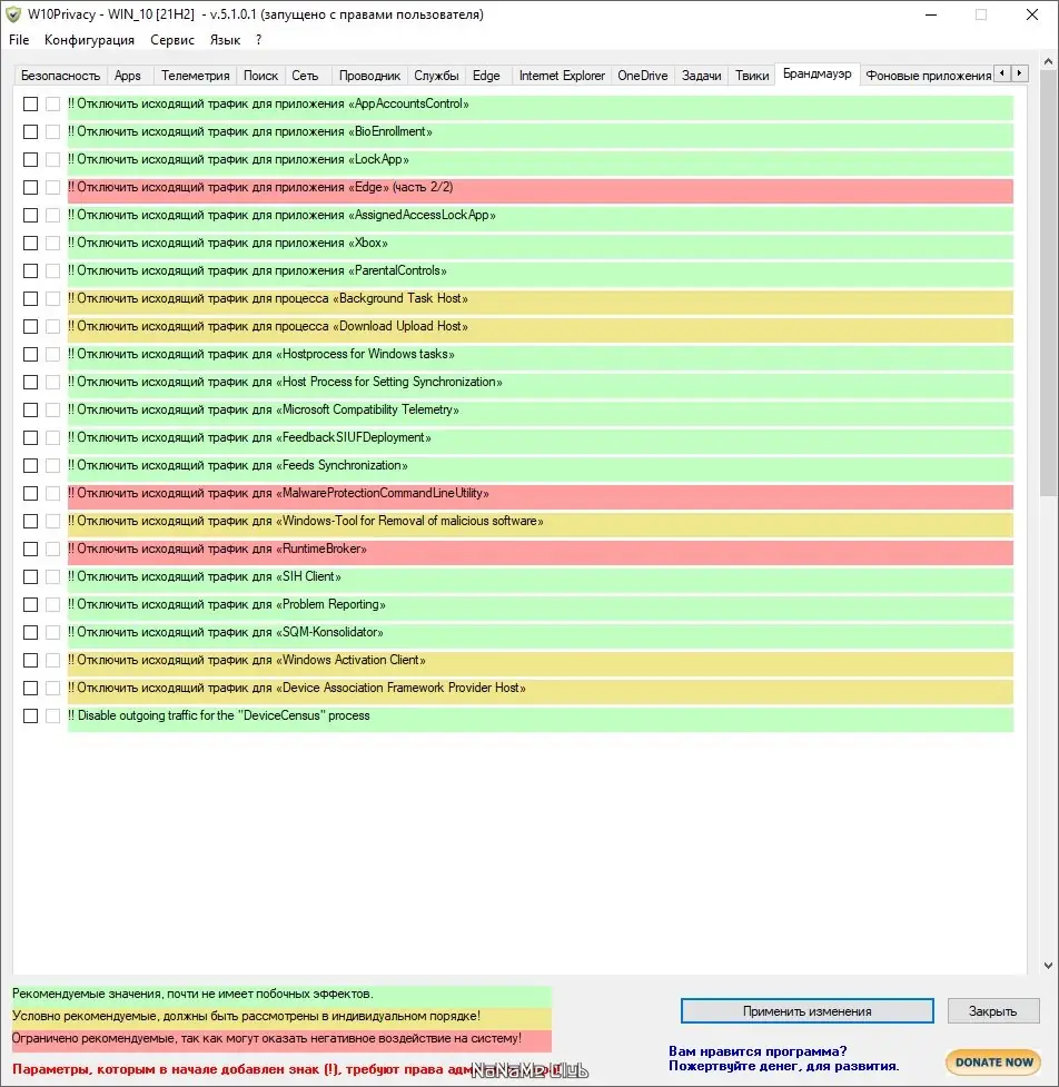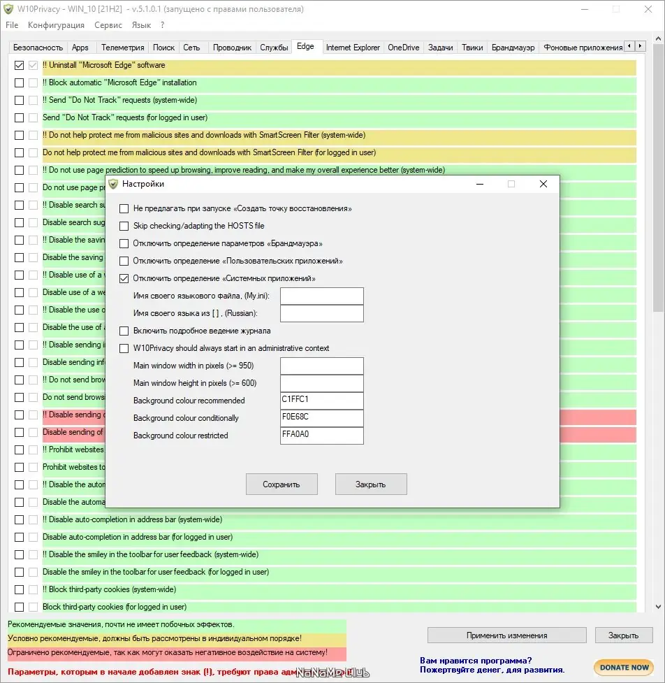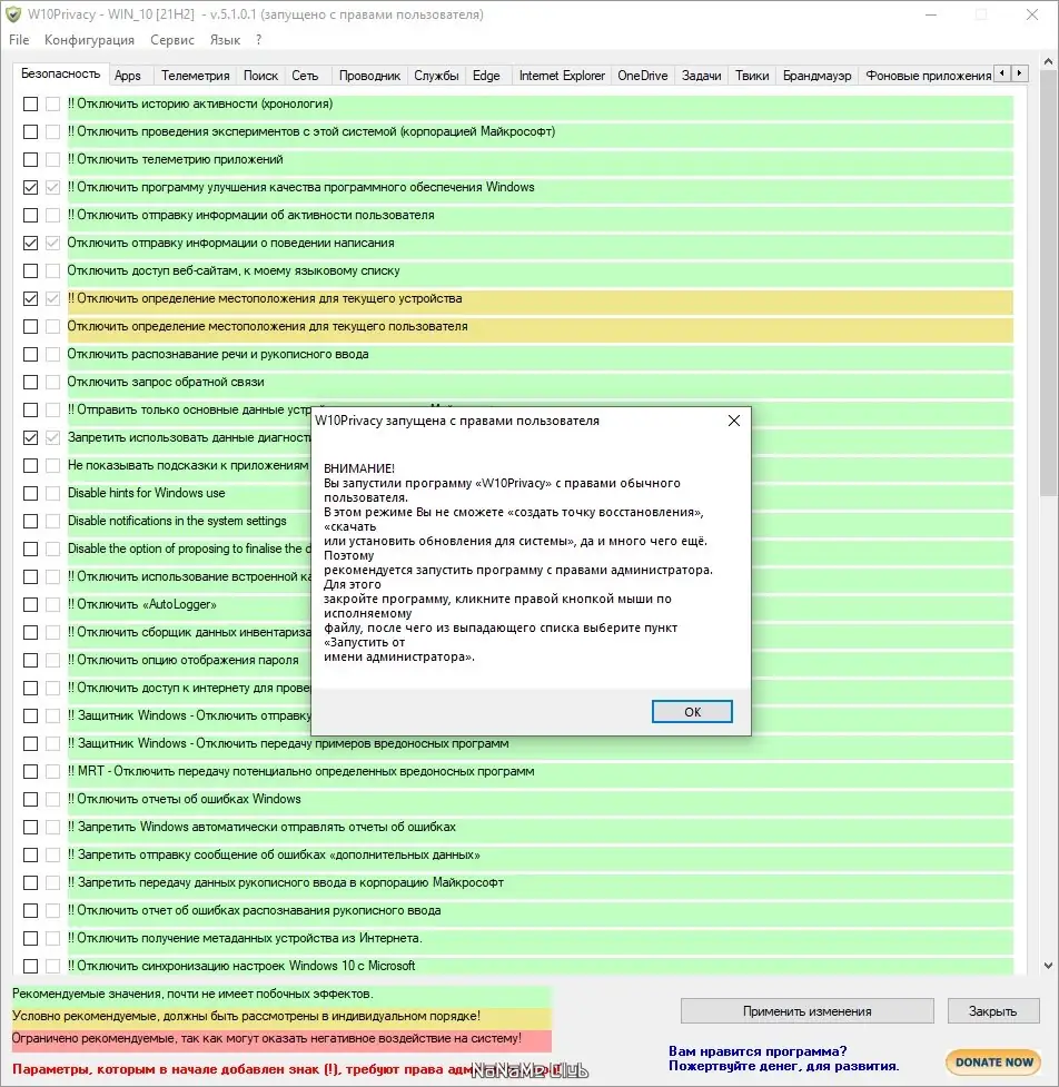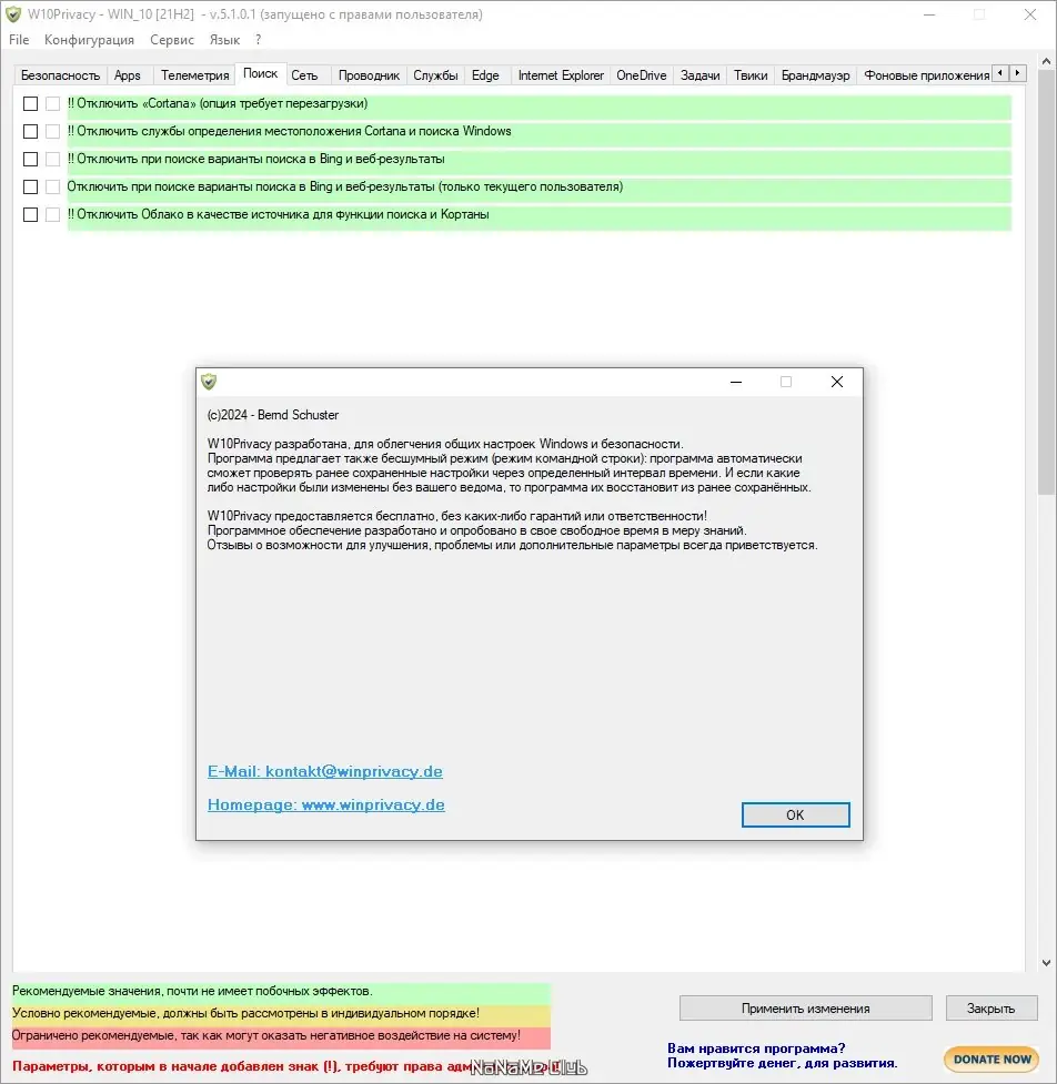 W10Privacy представляет собой специализированный твикер, ориентированный на защиту личных данных пользователей Windows 10. Программа позволяет управлять параметрами, связанными с телеметрией, диагностикой, фоновыми службами и облачной синхронизацией. Интерфейс разделён на 12 логических блоков, включая настройки безопасности, поведение Проводника, параметры поиска и интеграцию с OneDrive. Каждый элемент сопровождается цветовой индикацией: зелёный — безопасно, жёлтый — умеренный риск, красный — высокая вероятность нарушения стабильности. Такой подход помогает пользователю осознанно подходить к изменениям, минимизируя риски.