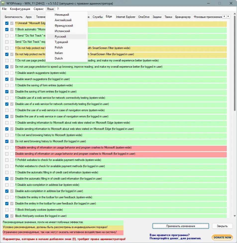 W10Privacy представляет собой специализированный инструмент для управления приватностью в экосистеме Windows. Она ориентирована на пользователей, которые стремятся контролировать, какие данные их системы передаются корпорации Microsoft и сторонним сервисам. Интерфейс программы организован по принципу модульности, разделяя все настройки на 12 логических категорий, таких как телеметрия, службы, поиск, браузер Edge, обновления и другие. Каждый параметр сопровождается цветовой индикацией: зелёный — безопасно, жёлтый — требует внимания, красный — может повлиять на стабильность. Это позволяет принимать обдуманные решения при отключении или активации функций.