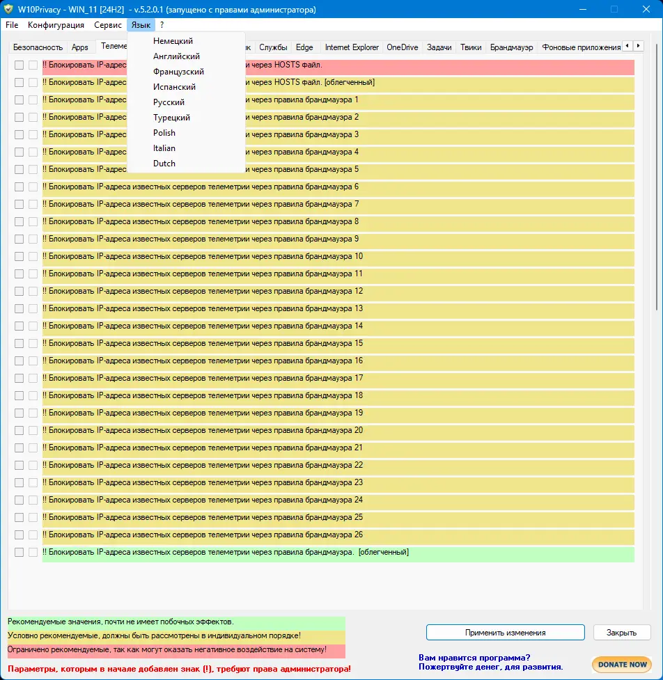 W10Privacy представляет собой инструмент, предназначенный для тонкой настройки параметров безопасности и конфиденциальности в среде Windows. Программа позволяет изменять системные настройки, отвечающие за передачу диагностических данных, работу ассистента Cortana, функции поиска и взаимодействие с облачными сервисами. Интерфейс разделён на 12 логических блоков, каждый из которых отвечает за определённую группу функций, таких как телеметрия, обновления, службы, браузер Edge и другие компоненты системы.