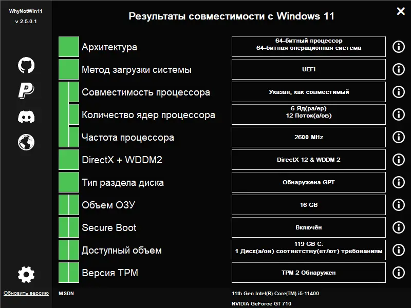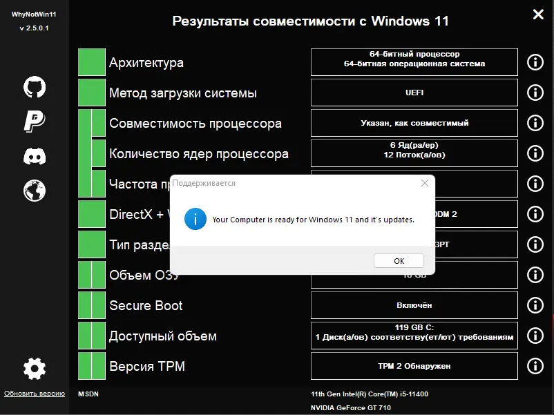 Утилита WhyNotWin11 позволяет быстро определить, соответствует ли ваш компьютер требованиям для установки операционной системы Windows 11. Программа анализирует ключевые аппаратные компоненты, включая процессор, ОЗУ, TPM, безопасную загрузку и графическую систему, и наглядно отображает результат. Это удобное решение для пользователей, которые планируют обновить систему, но не уверены в совместимости своего оборудования.