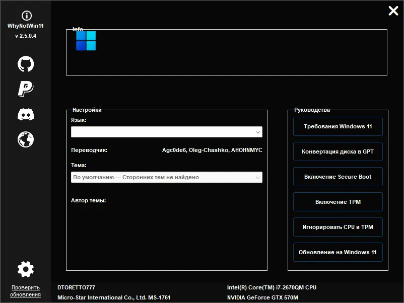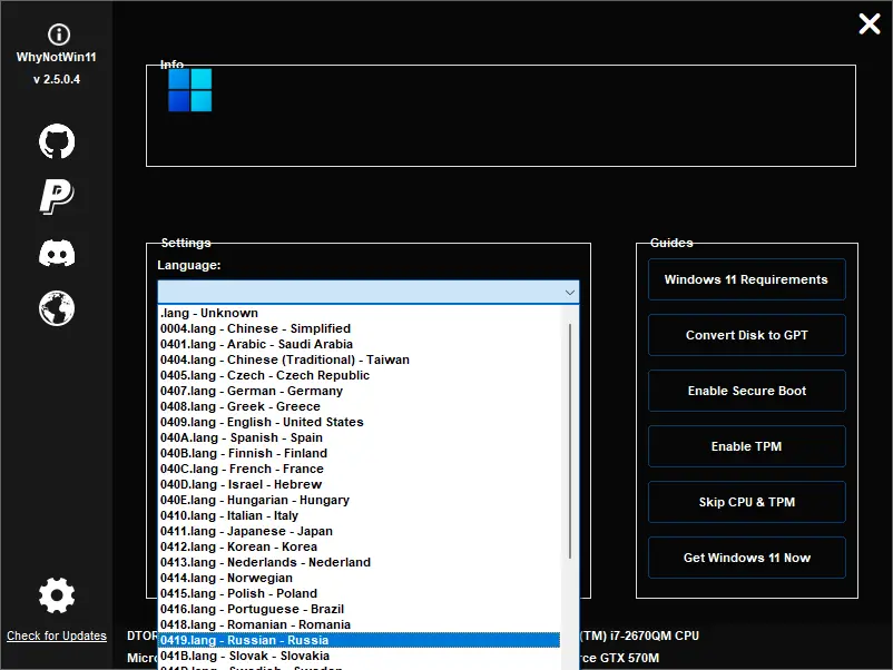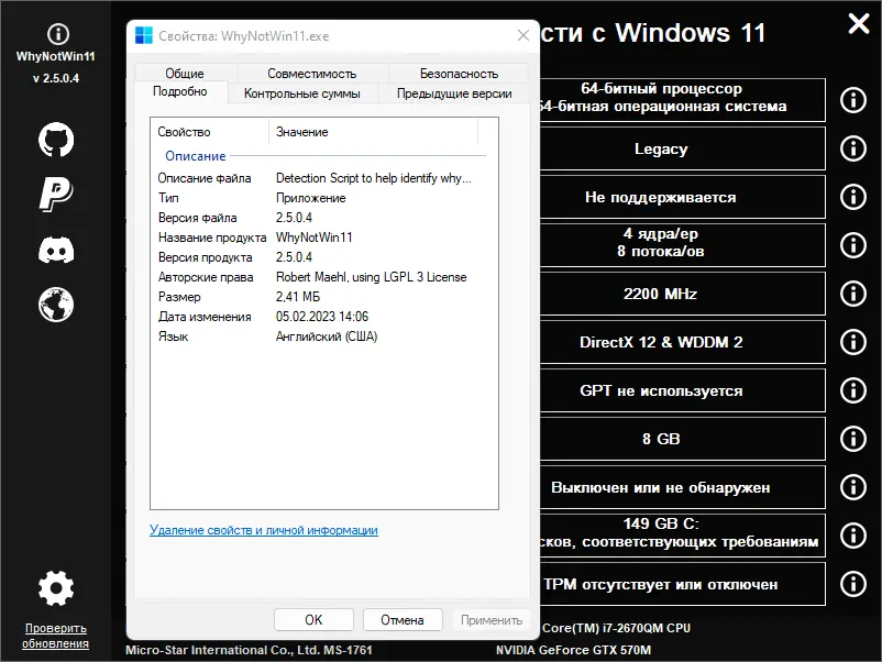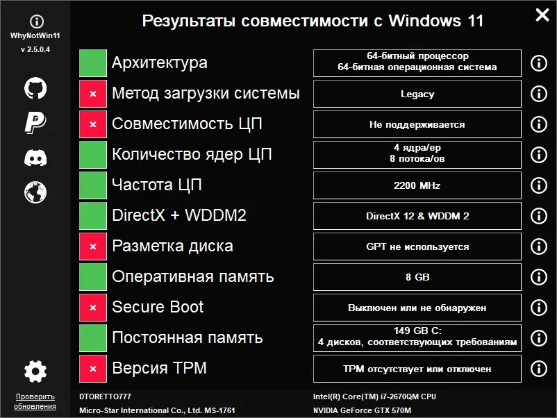 WhyNotWin11 — это легковесная утилита, которая анализирует аппаратные характеристики компьютера и определяет его совместимость с операционной системой Windows 11. Программа проверяет наличие всех необходимых компонентов, включая процессор, ОЗУ, TPM, безопасную загрузку и поддержку DirectX 12. Результаты отображаются в понятном виде, помогая пользователю быстро понять, соответствует ли система требованиям новой ОС.
