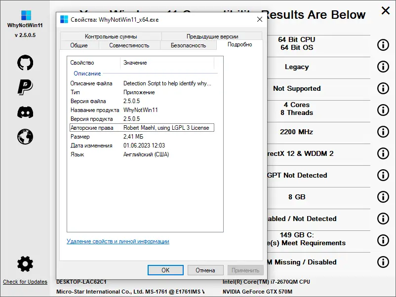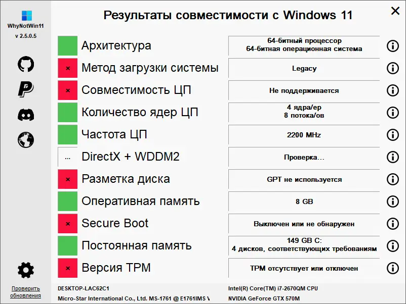 Утилита WhyNotWin11 позволяет быстро определить, соответствует ли ваше оборудование требованиям для установки операционной системы Windows 11. Программа анализирует ключевые компоненты системы, включая процессор, объем ОЗУ, наличие TPM и поддержку безопасной загрузки. Результаты проверки отображаются в понятном виде, что помогает заранее оценить возможность перехода на новую версию ОС.