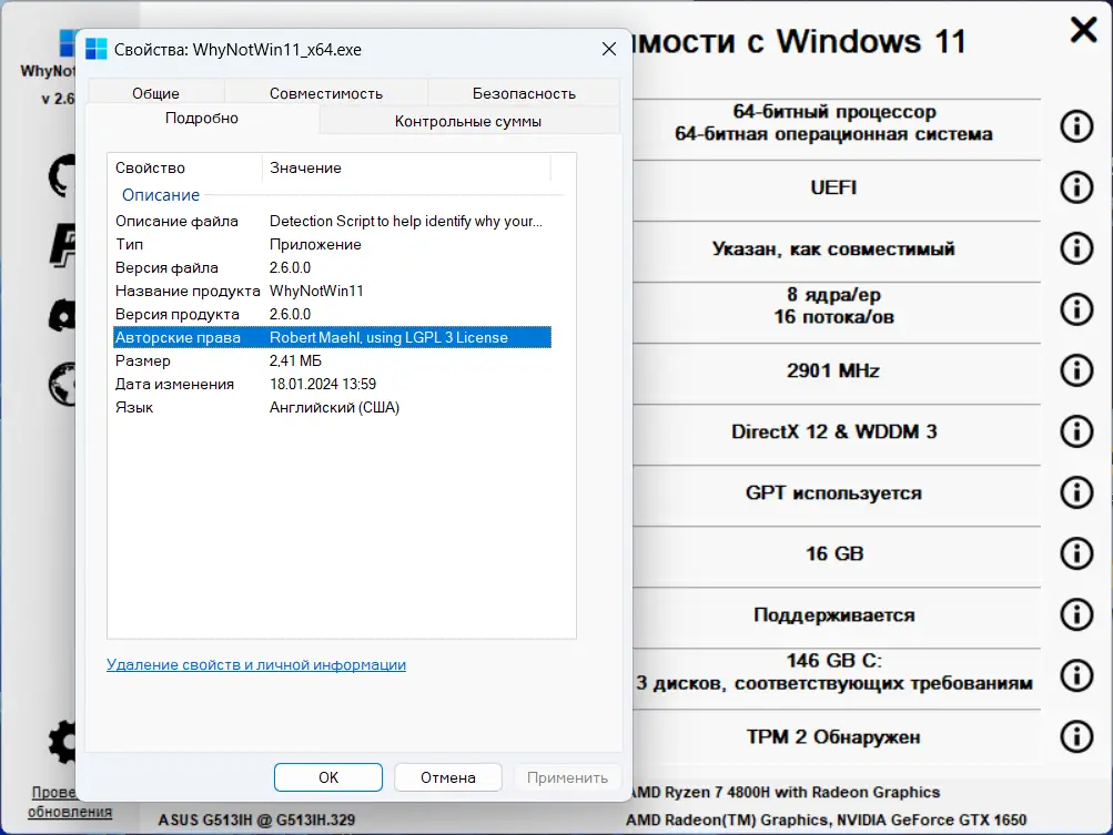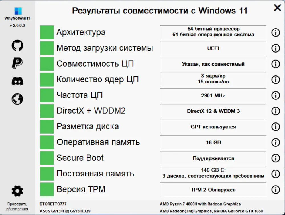Утилита WhyNotWin11 позволяет быстро определить, соответствует ли ваш компьютер требованиям для установки операционной системы Windows 11. Программа анализирует ключевые аппаратные компоненты: процессор, оперативную память, накопитель, TPM-модуль и поддержку безопасной загрузки. Результат проверки отображается в понятном виде, указывая на возможные проблемы совместимости.