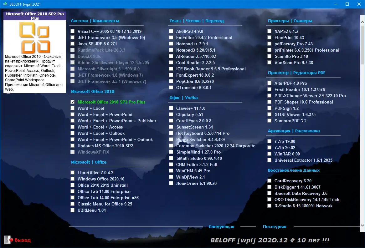 BELOFF представляет собой тщательно структурированный сборник программ, объединяющий более сотни приложений из различных категорий: офисные пакеты, редакторы текста и изображений, средства обслуживания системы, мультимедиа, инструменты для работы с дисками и реестром, утилиты для восстановления данных и дефрагментации. Особенность проекта — продуманная автоматизация установки через WPI, что позволяет выбирать нужные программы и устанавливать их в один клик. Все компоненты распределены по тематическим группам, что упрощает навигацию даже новичку.