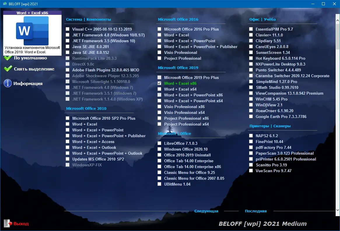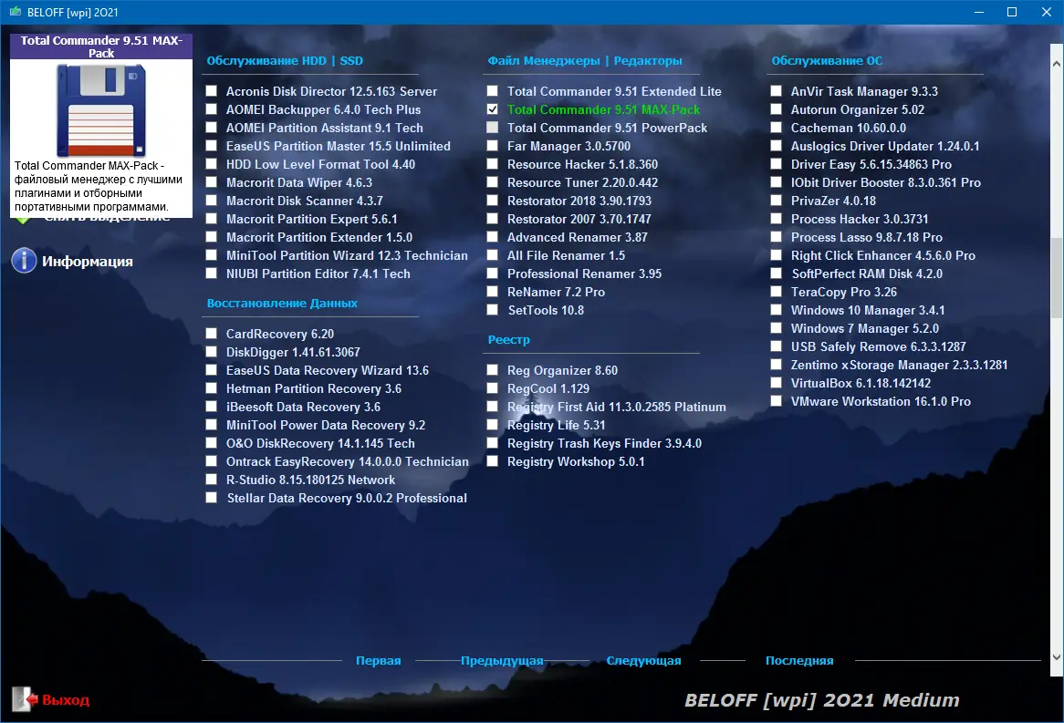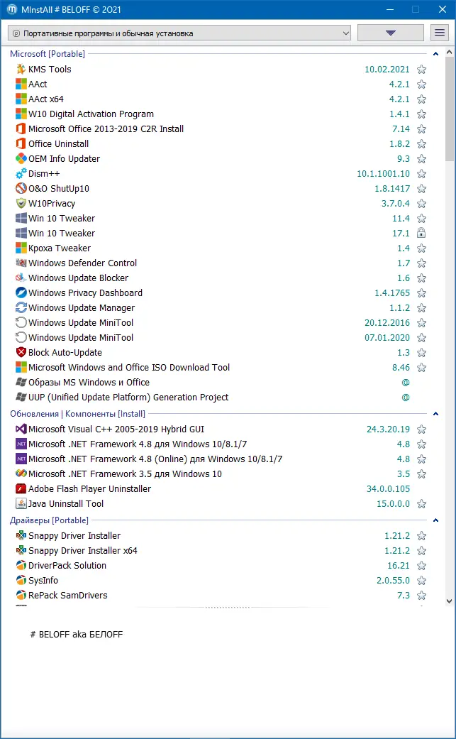 BELOFF представляет собой тщательно структурированный сборник программного обеспечения, ориентированный на пользователей операционных систем Windows. Все приложения распределены по категориям, что упрощает навигацию и выбор нужного инструмента. В основе установки лежат технологии WPI и MInstAll, обеспечивающие автоматизированный процесс развертывания программ без необходимости ручного вмешательства. Сборка включает как полноценные версии софта, так и портативные, которые можно запускать напрямую с USB-накопителей или виртуальных приводов.