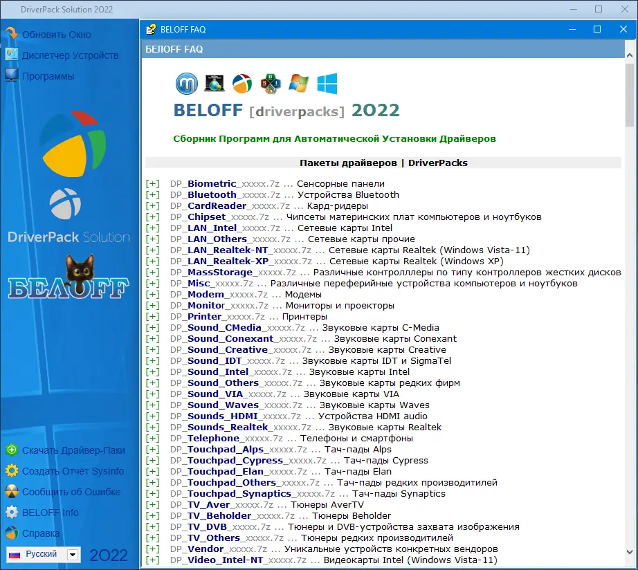 BELOFF — универсальный сборник драйверов с поддержкой автоматической установки на 32- и 64-битные системы Windows. Включает современные и устаревшие версии драйверов для комплектующих от ведущих производителей. Идеальное решение для настройки ПК после чистой установки операционной системы.