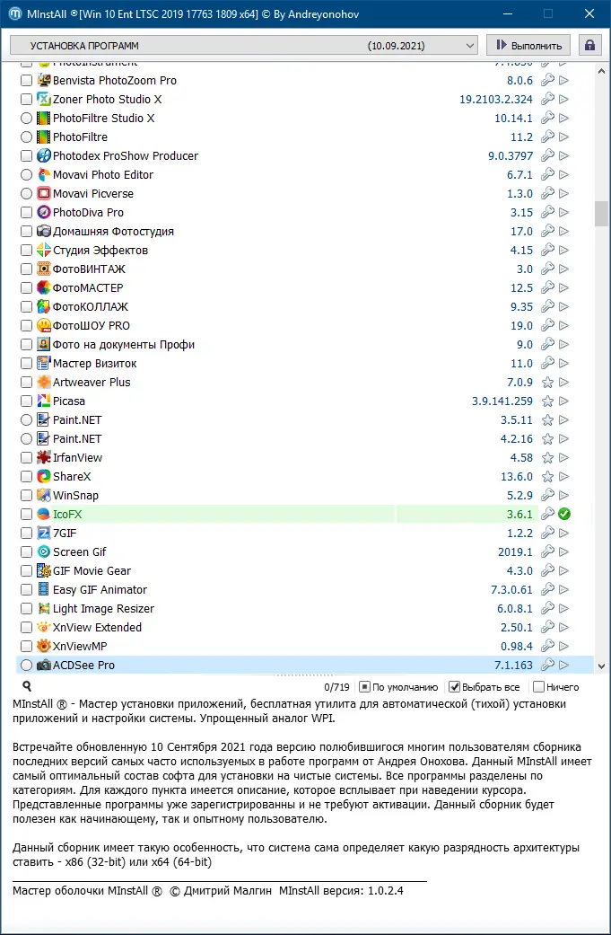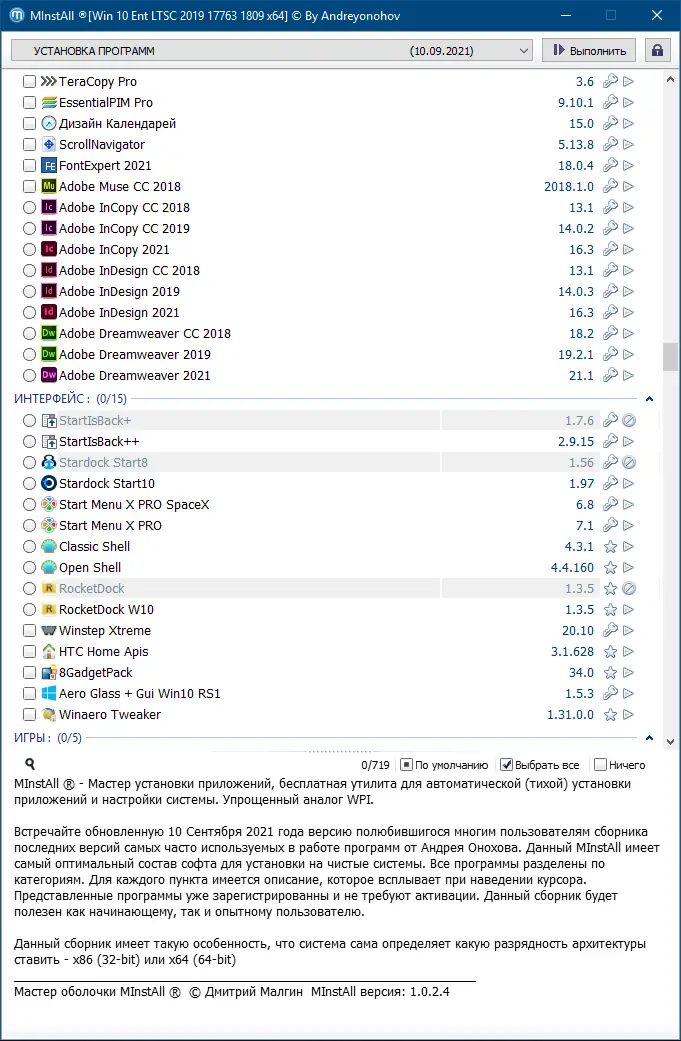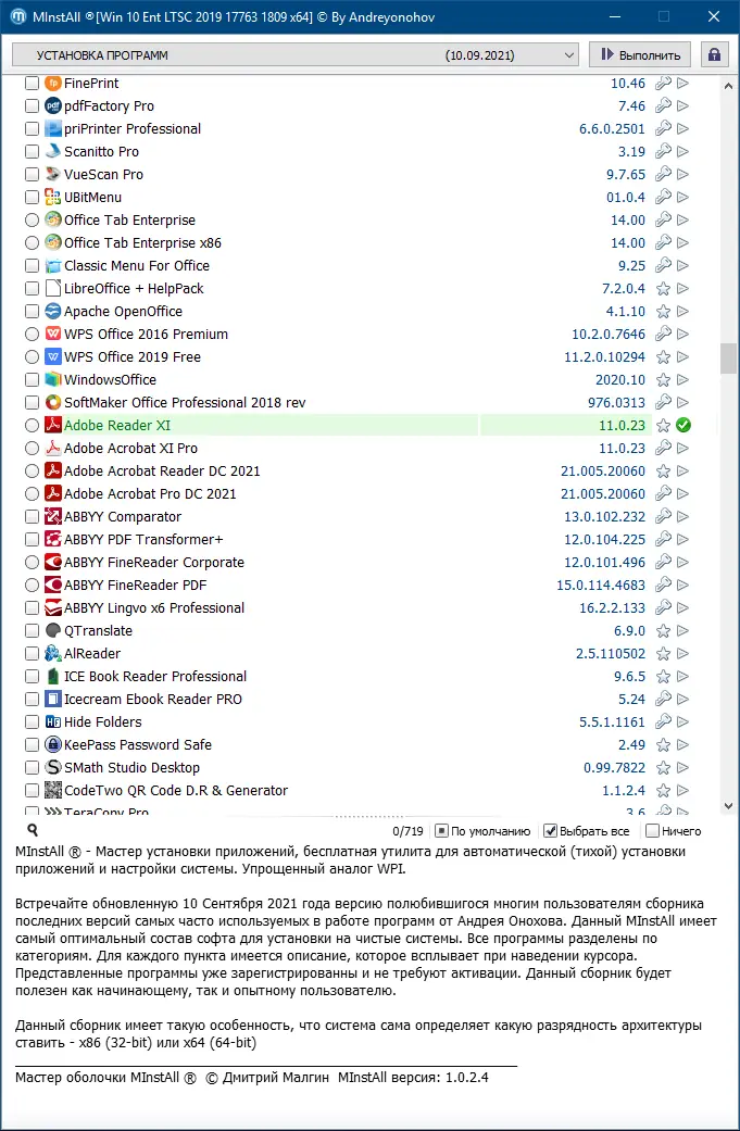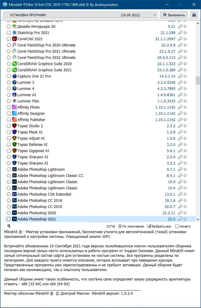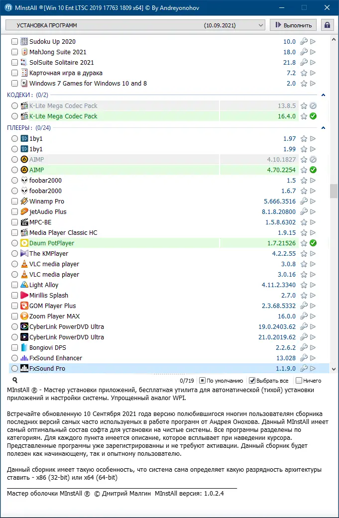 Популярная сборка программ MInstAll v.10.09.2021 от Андрея Онохова — это обновлённый набор необходимого софта для быстрой настройки системы. В составе — последние версии приложений для работы, интернета, мультимедиа и обслуживания ОС. Все компоненты предварительно активированы, установка происходит в автоматическом режиме через удобную оболочку, аналогичную WPI. Образ доступен для скачивания через торрент.