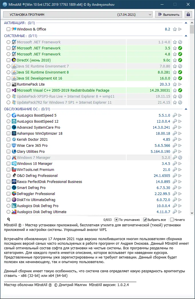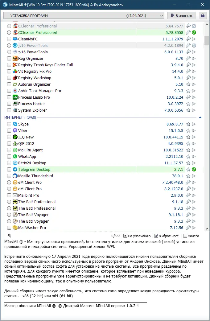 MInstAll — это универсальный набор программ для быстрой настройки и обслуживания компьютера, обновлённый 17 апреля 2021 года. Сборка включает последние версии популярного софта, предустановленные активаторы и удобный установщик, совместимый с 32- и 64-битными системами. Все приложения уже зарегистрированы и готовы к использованию сразу после установки.