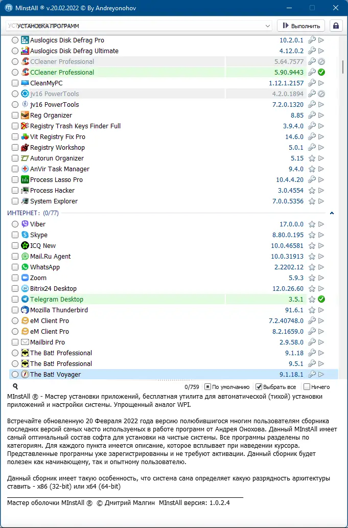 MInstAll — это универсальный сборник программного обеспечения от Андрея Онохова, обновлённый 20 февраля 2022 года. Он представляет собой удобную систему установки популярных приложений с автоматическим распознаванием разрядности системы. Сборка включает лицензионные версии программ, не требующие дополнительной активации, и предназначена для быстрой настройки рабочей среды на чистой операционной системе.