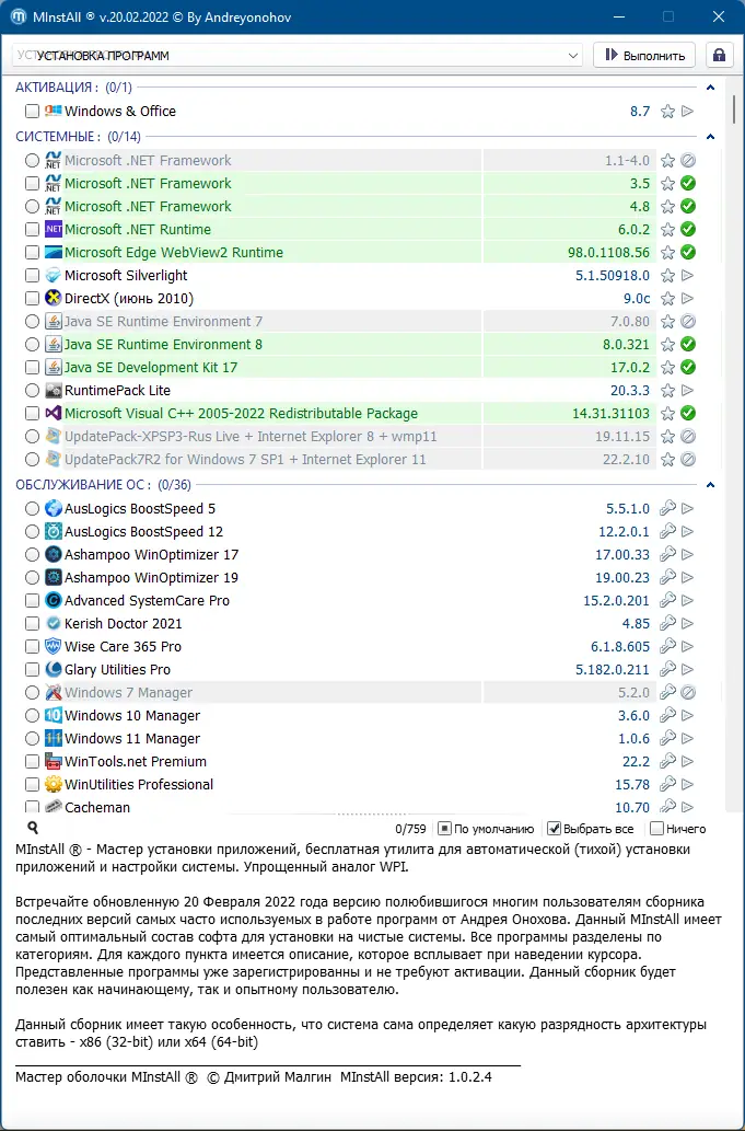 MInstAll — это универсальный сборник программ для быстрой настройки и обслуживания компьютера, собранный Андреем Оноховым. Версия обновлена 20 февраля 2022 года и включает последние версии софта для работы, мультимедиа, безопасности и администрирования. Установка осуществляется через удобную оболочку, совместимую с системами Windows 7–11, а все приложения уже готовы к использованию без дополнительной активации.