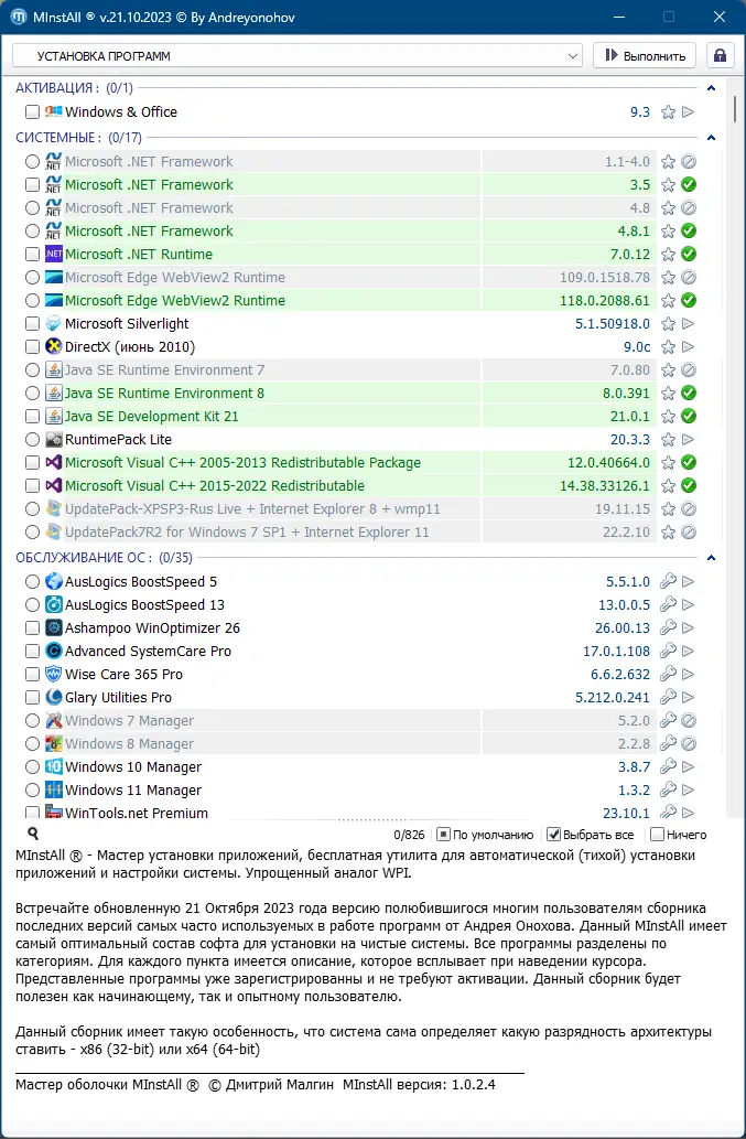 MInstAll — это обновлённая 21 октября 2023 года универсальная сборка программ от Андрея Онохова, предназначенная для быстрой и удобной установки необходимого программного обеспечения на чистые системы. Версия v by andreyonohov представляет собой упрощённый аналог WPI с новым мастером установки, автоматическим определением разрядности ОС и уже включёнными лицензиями на большинство приложений. Сборка распространяется папками, что упрощает обновление и выбор нужных компонентов. Включает в себя тысячи приложений из разных категорий — от офисных пакетов до профессиональных инструментов для редактирования мультимедиа и обслуживания системы.