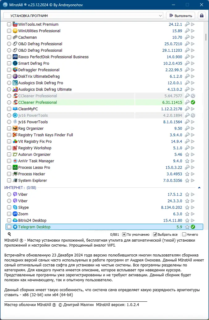 Сборка MInstAll v.23.12.2024 by Andreyonohov представляет собой оптимизированный пакет программ, предназначенный для быстрой и удобной установки на свежую операционную систему. Комплект включает в себя широкий спектр приложений, распределённых по тематическим категориям: офисные пакеты, браузеры, графические редакторы, утилиты для обслуживания системы, мультимедиа-плееры, инструменты для работы с дисками и виртуализации. Каждый элемент прошёл проверку на совместимость и оптимизирован под различные версии Windows. Интерфейс оболочки интуитивно понятен, а всплывающие подсказки помогают быстро сориентироваться в функционале установленных программ.