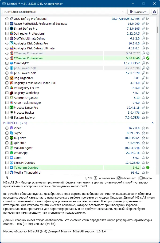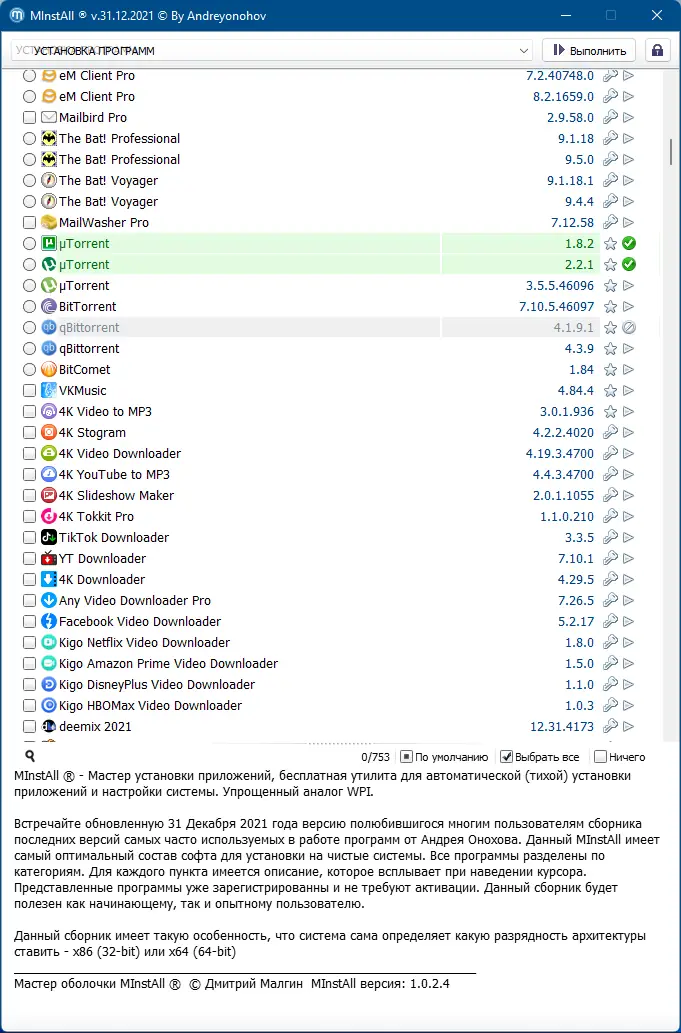 MInstAll — это универсальный сборник программ для быстрой настройки и обслуживания компьютера, созданный Андреем Оноховым. Обновлённая версия от 31 декабря 2021 года предлагает удобный мастер установки, автоматическое определение разрядности системы и предустановленные лицензионные версии софта. Сборка включает более 500 приложений для работы, интернета, мультимедиа, безопасности и администрирования, объединённых в понятную структуру. Все компоненты уже активированы, что исключает необходимость поиска ключей и патчей. Распространяется в виде ISO-образа, доступного для скачивания через торрент.