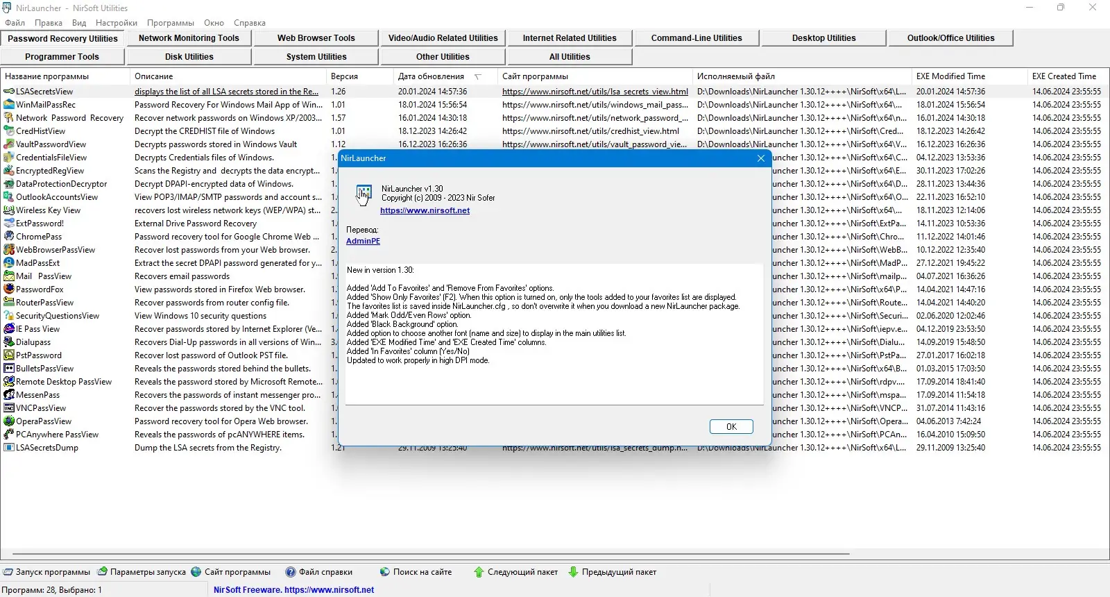 Пакет NirLauncher создан для удобного объединения множества утилит, разработанных командой NirSoft. Все инструменты собраны в единую оболочку, что упрощает их поиск, запуск и использование. Каждая утилита является портативной, не требует установки и может быть запущена непосредственно с внешнего носителя. Это делает решение особенно полезным при обслуживании чужих компьютеров или при работе в условиях ограниченного доступа к системе.