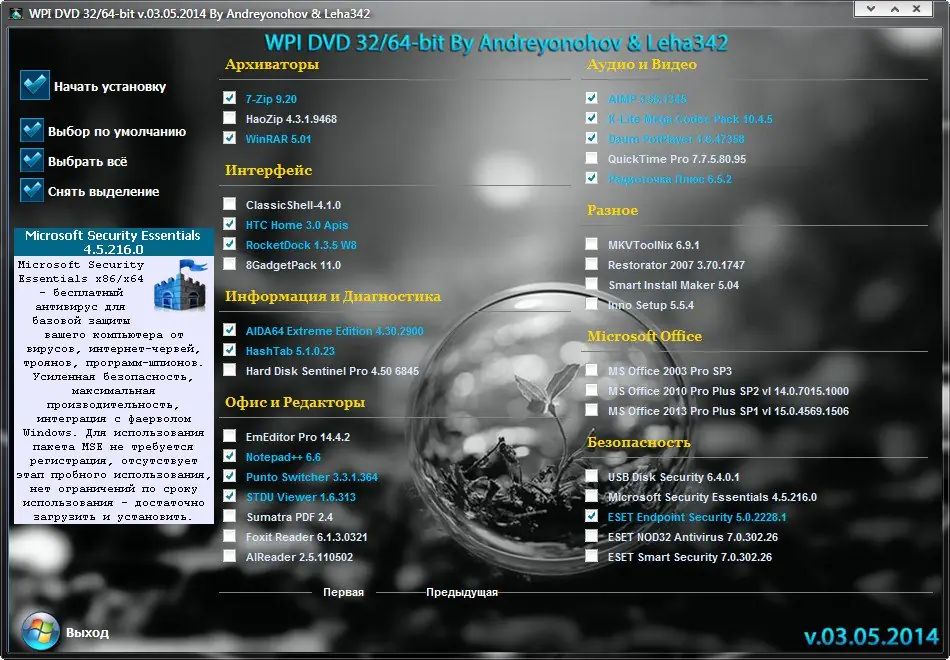 WPI DVD представляет собой тщательно сформированный комплекс программного обеспечения, предназначенный для комплексной настройки компьютера после установки операционной системы. Сборка была обновлена 3 мая 2014 года и включает в себя все актуальные на тот момент версии приложений, необходимые как для повседневной работы, так и для обслуживания системы. Все компоненты предварительно зарегистрированы, что избавляет пользователя от необходимости искать ключи или патчи.