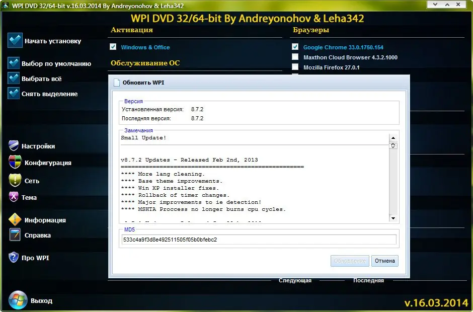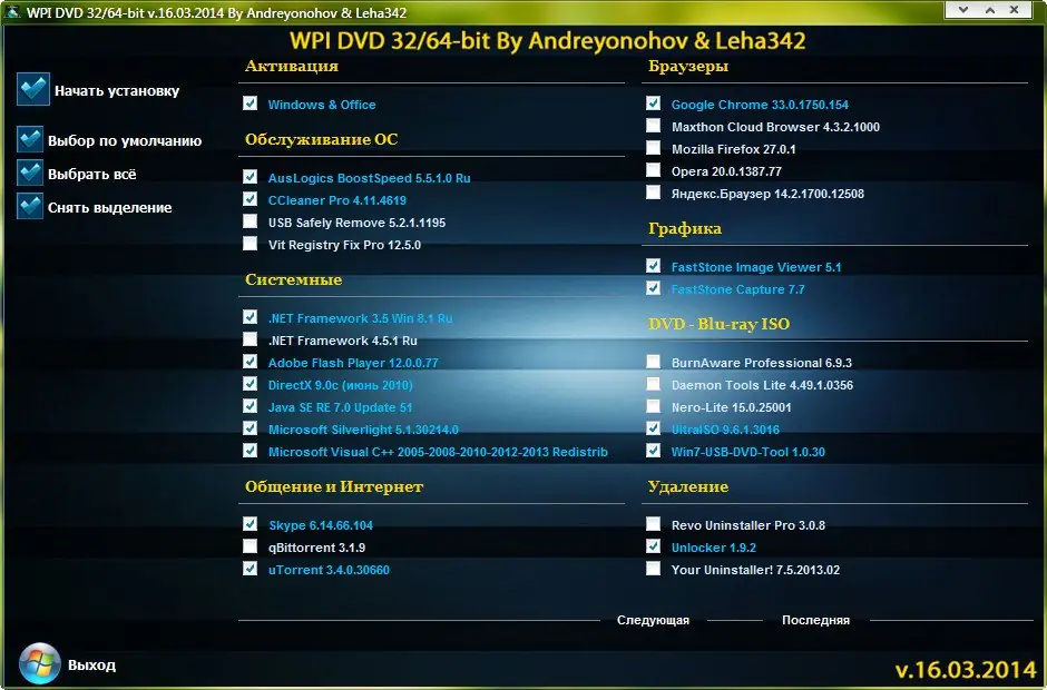 WPI DVD — это универсальный набор программ, собранный на базе WPI-оболочки Андрея Онохова и обновлённый 16 марта 2014 года. Сборник включает последние версии популярного софта, разделённого по категориям, с автоматическим определением разрядности системы. Все приложения уже активированы и готовы к установке на чистую операционную систему.