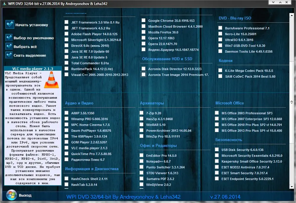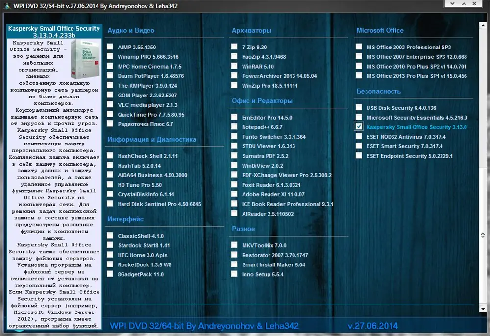 WPI DVD — это универсальный сборник программного обеспечения, созданный Андреем Оноховым для быстрой и удобной установки необходимого софта на чистую операционную систему. Версия от 27 июня 2014 года включает в себя обновлённые и тщательно подобранные приложения, разделённые по категориям, с автоматическим выбором разрядности системы. Все компоненты предварительно активированы и готовы к использованию сразу после установки.