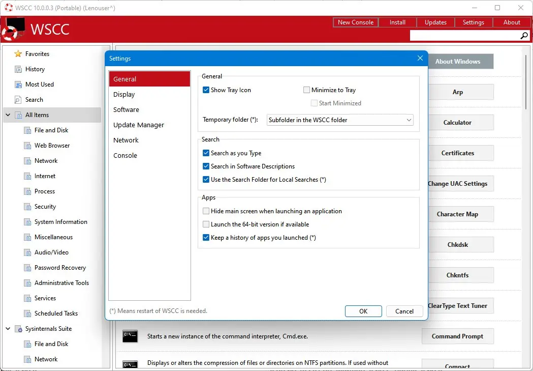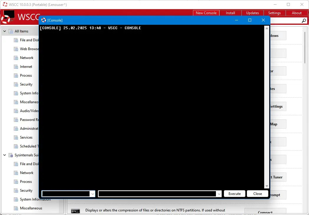 WSCC — это портативное приложение, предназначенное для централизованного управления системными утилитами Windows. Оно объединяет функционал Sysinternals Suite и NirLauncher, обеспечивая быстрый доступ к более чем 300 инструментам для диагностики, настройки и восстановления операционной системы. Программа не требует установки и поддерживает обновление компонентов, включая встроенный модуль проверки новых версий.