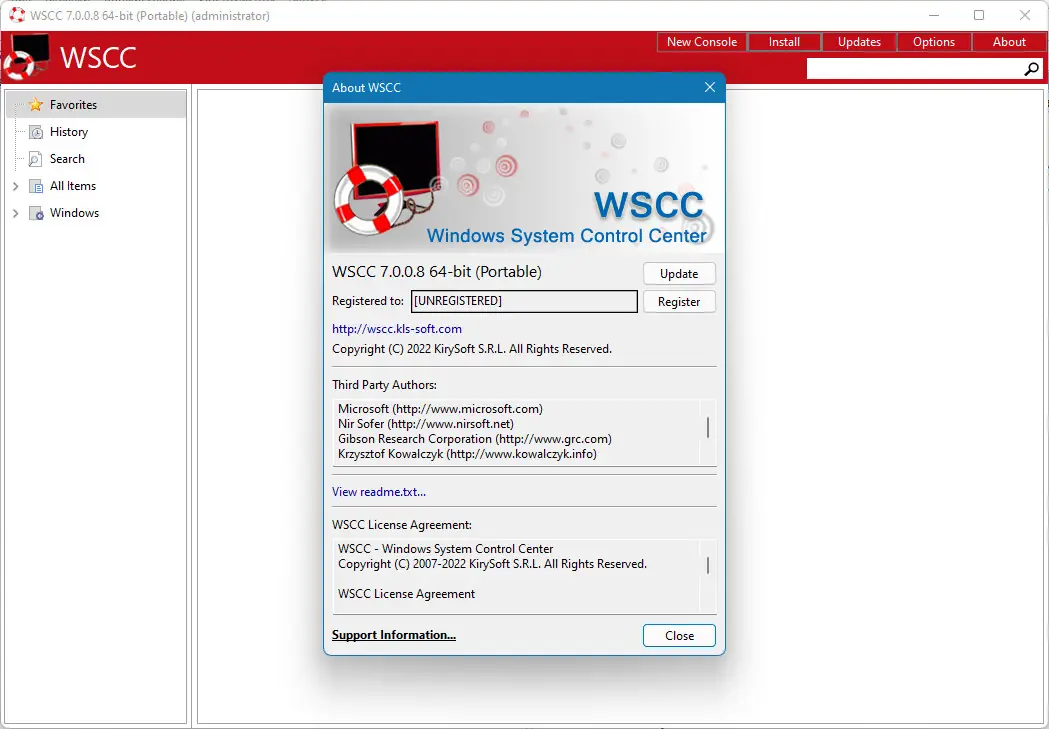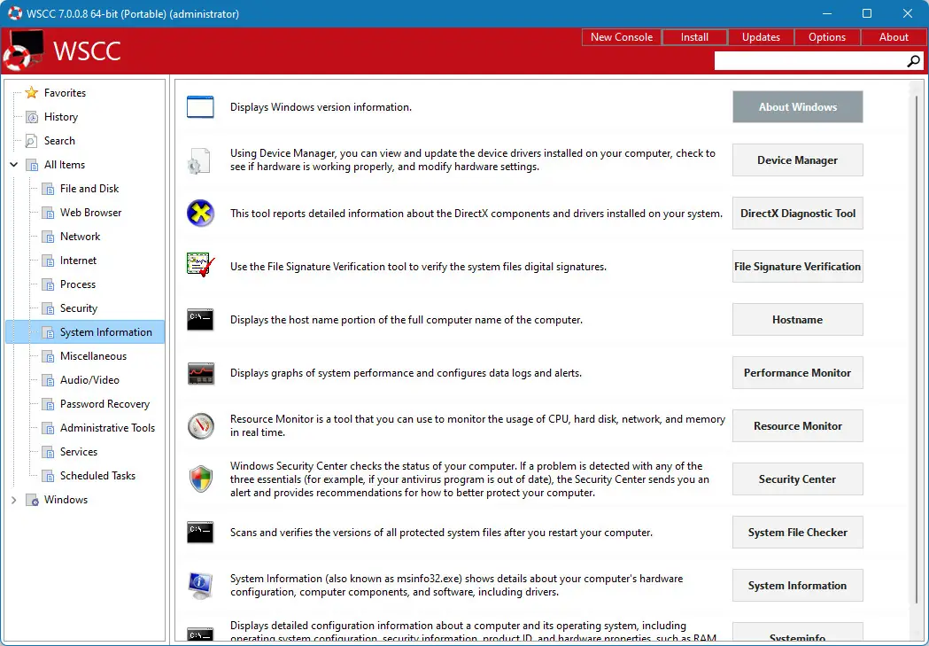 WSCC — это портативный центр управления системой Windows, объединяющий мощные наборы утилит Sysinternals Suite и NirLauncher. Программа позволяет быстро запускать, организовывать и обновлять более 300 инструментов для диагностики, настройки и восстановления операционной системы. Интерфейс разделён по категориям, поддерживает поиск, избранное и встроенные средства Windows, что делает работу с инструментами максимально удобной.