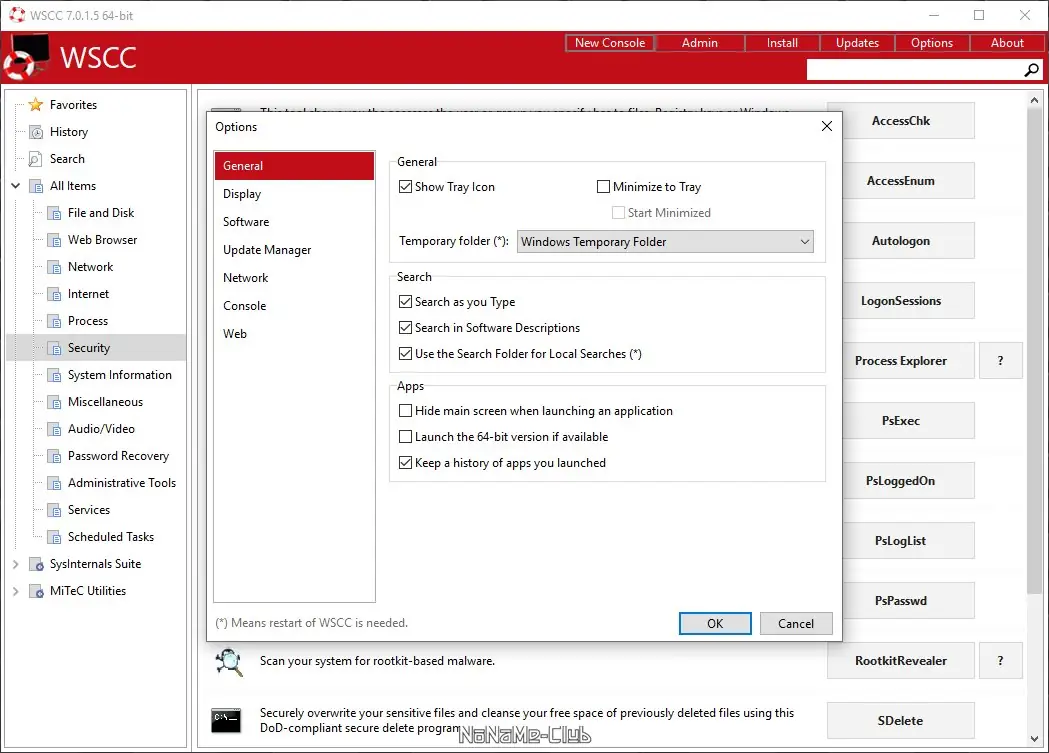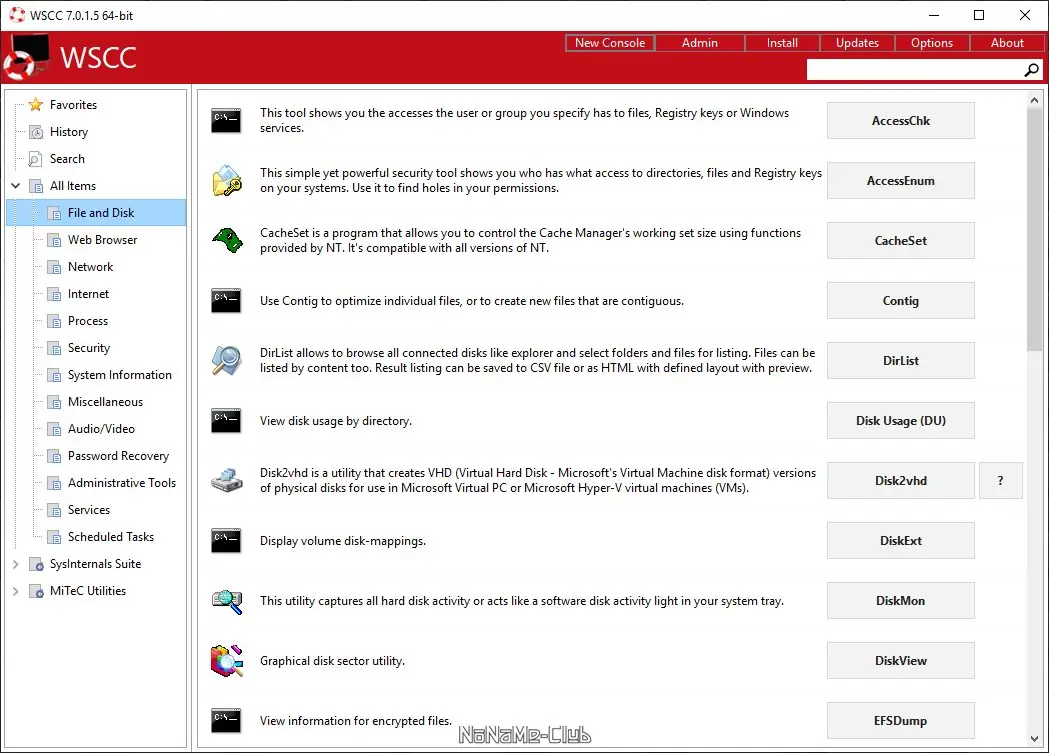 WSCC — это портативная оболочка для управления системными утилитами Windows, объединяющая инструменты из пакетов Sysinternals Suite и NirLauncher. Программа позволяет быстро запускать более 300 служебных приложений, сгруппированных по категориям, и включает средства обновления, поиска и настройки. Утилита подходит для системных администраторов и пользователей, которым необходим комплексный доступ к диагностике и настройке операционной системы.