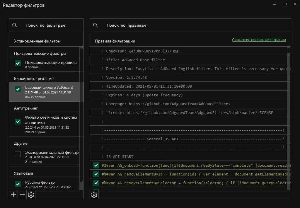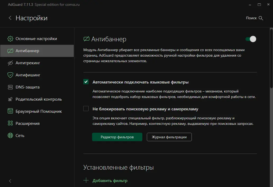 - Поддержка пользовательских фильтров и гибкая настройка правил блокировки.